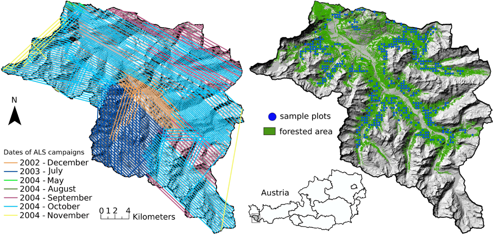 The authors would like to thank the Landesvermessungsamt Feldkirch, Austria for granting the use of the LiDAR data, and the Stand Montafon Forstfonds for supplying the forest inventory data. This study was partly done within the project LASER-WOOD (822030) which is funded by the Klima- und Energiefonds in the framework of the program NEUE ENERGIEN 2020.