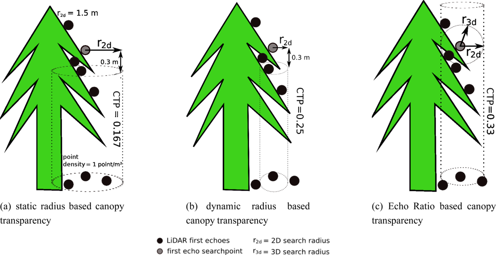 As illustrated in Figure 2(c), n3d is defined as the number of first echoes (including the search point) found in a dynamic search distance measured in 3D. n2d is the number of first echo points found in the same distance measured in 2D, whereas the vertical expansion of the search cylinder is infinite. The dynamic search distance is calculated according to Equation 5 taking the varying point densities of the sample plots into account. ER decreases from dense (non-transparent) to less dense (transparent) vegetated areas.