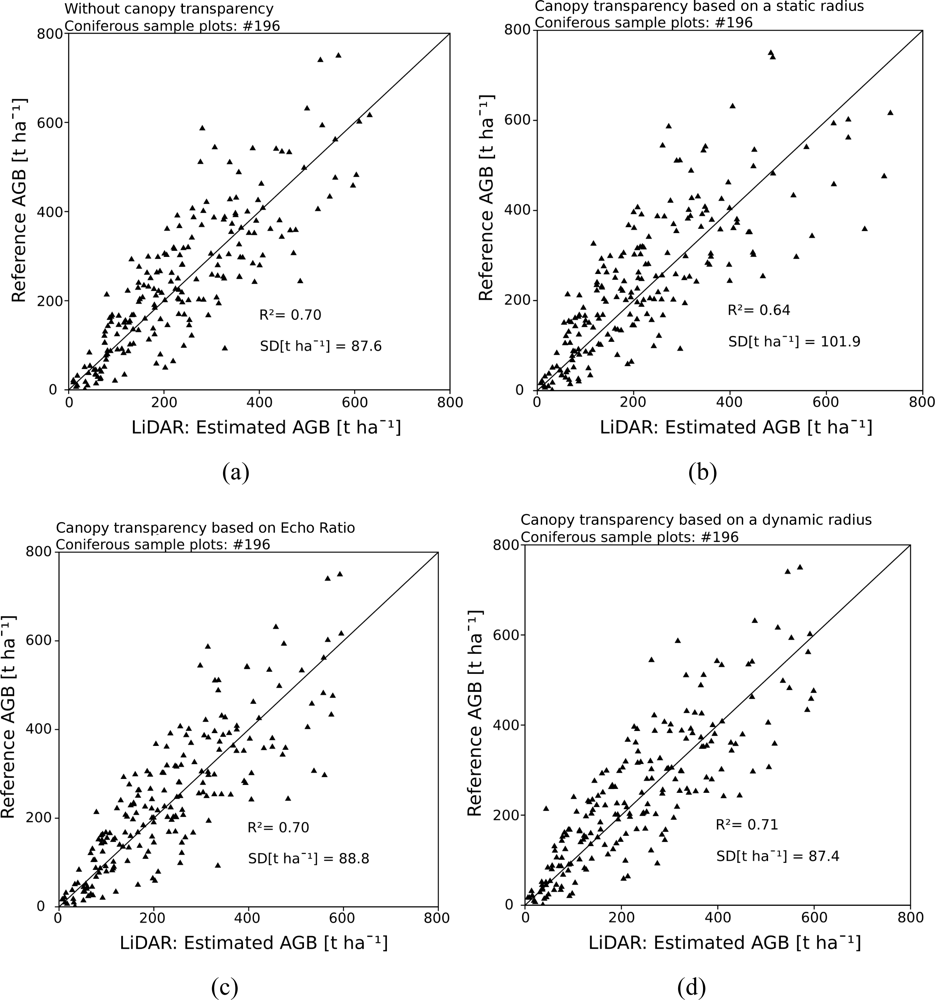 Calibrating the model without using a CTP results in a R2 of 0.70 and a SD of the prediction errors of 87.6 t ha−1 (35.8%). Extending the model by the CTP based on a static radius of 1.0 m degrades the R2 to 0.64, while the SD of the prediction errors increases to 101.9 t ha−1 (41.7%). Normalizing the number of points found below the current canopy point by the sample plot point density DPfe is required (Equation (4)). If DPfe is not considered, R2 decreases to 0.55, while the SD of the prediction errors increases to 113.7 t ha−1 (46.5%). Introducing the CTP based on the ER as a measure for transparency of vegetation towards the laser beams results in a R2 of 0.70 and in a SD of the prediction errors of 88.8 t ha−1 (36.3%). Extending the model by the CTP based on a dynamic search radius a R2 of 0.71 and a SD of the prediction errors of 87.4 t ha−1 (35.8%) is achieved. The accuracy statistics, the β coefficients of the calibrated models and the p-values of the corresponding input parameters are shown in Table 3. Figure 3 shows the scatter plots of the reference AGB versus the AGB estimated from LiDAR data.