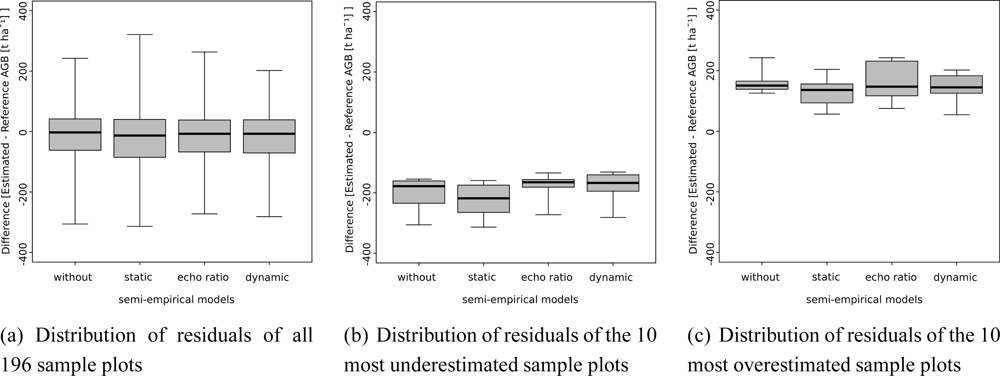 Within the EDA all 196 selected sample plots are analyzed according to their under- and overestimation of AGB by the different models. Additionally, the 10 sample plots leading to the highest under- and overestimation, respectively, by the original model are selected for further analysis. This procedure is based on the assumption that the original model leads to outliers concerning AGB estimation due to the heterogeneity of the properties of the vegetation within the study area. Analyzing these sample plots separately offers the possibility to check if the integration of CTPs is useful to consider the varying properties of the vegetation of the outlying sample plots in a proper way. The box-whisker plots in Figure 4 (a−c) indicate the distribution of residuals of the different models. The distribution of all 196 sample plots is shown in Figure 4(a). The introduction of the CTP based on the dynamic search radius leads to a box-whisker plot whose minimum-maximum range is slightly smaller than the range of the box-whisker plot resulting from the model not using a CTP (Figure 4(a)). The model without any CTP leads to values concerning under- and overestimation ranging from −305.91 t ha−1 to 242.50 t ha−1. The model based on a dynamic search radius results in values ranging from −281.50 t ha−1 to 202.00 t ha−1. The median value changes from −2.78 t ha−1 to −7.30 t ha−1 meaning that a higher amount of sample plots is underestimated by using the model based on a dynamic search radius (103 sample plots versus 108 sample plots). The CTP based on a static search radius does not lead to any improvement at all. It degrades the results, which can also be concluded from the R2 value in Section 4.2. In Figure 4(b,c) the distribution of residuals of sample plots that are strongly under- and overestimated by the original model are analyzed. Underestimation can be compensated using either the CTP based on the ER or on a dynamic search radius, whereas the density parameter based on the ER has the most significant effect. Compared to the original model both density parameters lead to an increase of the minimum, maximum, median and the values of the interquartile. The CTP based on a static search radius does not lead to any improvement of sample plots being strongly underestimated by the original model and leads to a decrease of these values. In Figure 4(c) strongly overestimated sample plots are compared to each other. In this case the CTP based on a static search radius shows the best results and is able to minimize the overestimations. The values of the interquartile as well as the minimum and maximum values decrease. A decrease of the median, minimum and maximum values can also be observed for the distribution based on the model using a dynamic search radius, whereas the value of the third quartile increases. The model using the CTP based on the ER degrades the results concerning AGB estimation of the 10 sample plots selected for investigation in Figure 4(c).