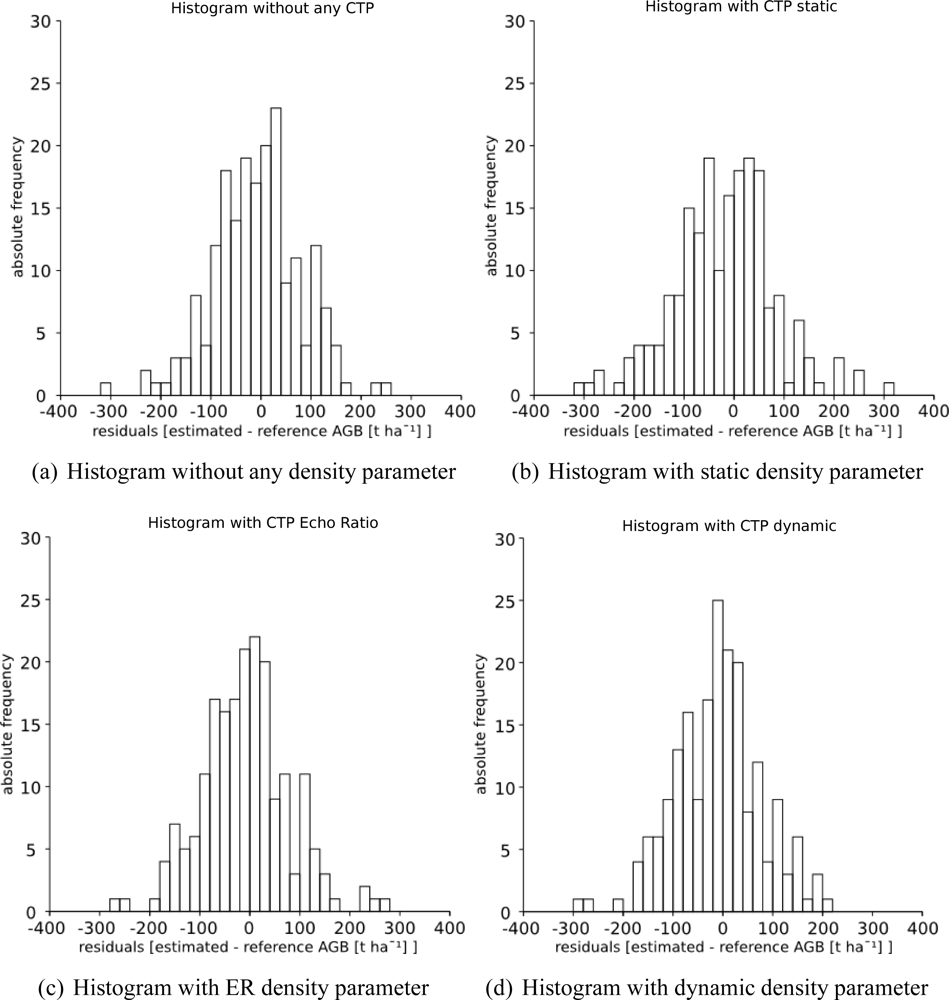 Each of the LiDAR based CTPs (Section 3.2) is integrated in the semi-empirical AGB model (Section 3.1). This leads to four different semi-empirical models (including the model without a CTP), which are analyzed according to their predictive accuracy. The canopy transparency is calculated for every single first echo point. The integration of CTP is performed by altering Equation 2 as:
