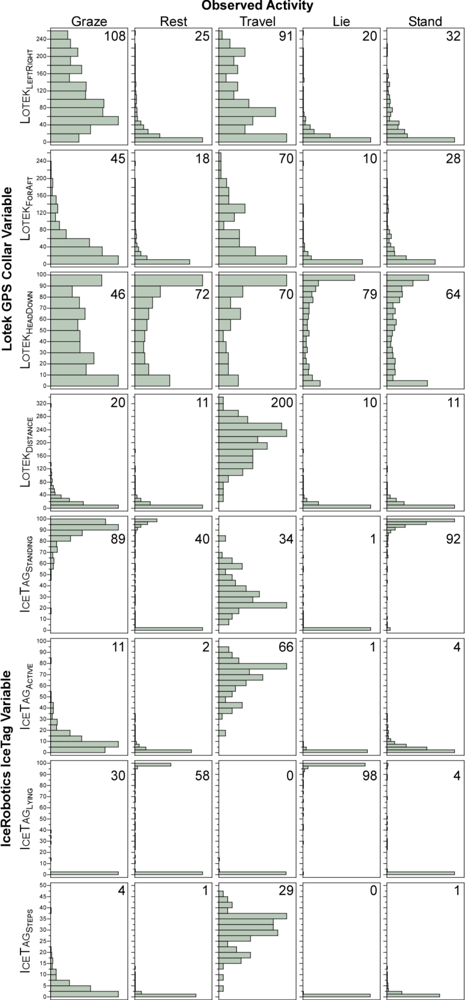 When the activity was defined as Graze, the Lotek collar left-right motion-sensor count (LotekLeftRight) for a 5-min interval ranged from 0 to 255 with a peak in the distribution in the region of 40 to 60, and a mean value of 108. Travel also yielded a diffuse frequency distribution, although with a greater proportion of values in the low range, and a mean value of 91. Rest yielded a highly skewed frequency distribution, with 75% of values being ≤ 30 and 13% being exactly 0 but, nevertheless, the entire range of possible values was obtained. For Rest the mean value of LotekLeftRight was 25; and subdivision into Stand and Lie yielded similar results, although Lie yielded a more strongly skewed distribution, with 75% quantile values of 20 and 44 for Lie and Stand, respectively.