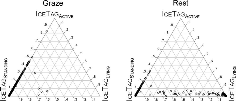 The three IceRobotics variables representing the time allocation between the device-defined states of standing (IceTagStanding), lying (IceTagLying), and active (IceTagActive) were examined together because they sum to 100%. Figure 2 shows these allocations as a series of ternary plots. The vast majority of points representing Graze activity fell on the IceTagStanding -IceTagActive axis for IceTagLying = 0%, with IceTagStanding values >50%. Almost all points representing Travel also fell on this same axis, although most of them were spread broadly over the range 35% < IceTagActive < 95%.