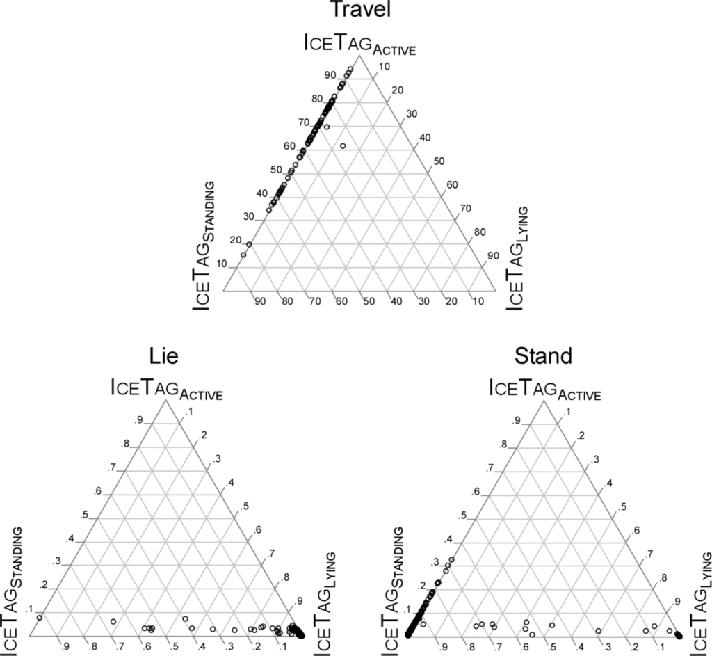 The majority of points representing Rest were distributed along an IceTagStanding -IceTagLying axis of approximately IceTagActive = 5%. The Lie subdivision of Rest yielded a large concentration of points near IceTagLying = 100%, and the Stand subdivision of Rest yielded a large concentration of points on the IceTagStanding -IceTagActive axis for IceTagLying = 0%, with IceTagStanding values >80%.
