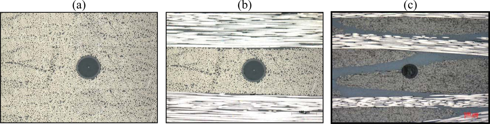 Another issue is the distortion of the composite structure in the surroundings of the optical fibre. The size of the FBG sensor ranges from 125 μm (which is a classical telecom fibre) down to 52 μm [21]. This is still one order of magnitude larger than the most commonly used reinforcement fibres (glass: 5–20 μm, carbon: 5–10 μm). Thus, the embedded optical fibre will inevitably cause a local distortion in the host material (Figure 1).