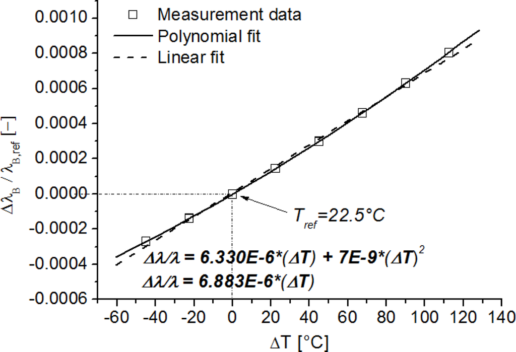 Pal et al. [39] already fitted data of temperature calibrations of fibre Bragg gratings to higher order polynomials and found satisfying results for a quadratic polynomial. An example of typical non-linear effects in the temperature calibration curve of an FBG written in a Ge-doped optical fibre is shown in Figure 3. Here, the normalized wavelength shift ΔλB/λB is plotted against the temperature shift ΔT, with respect to a reference temperature (e.g., Tref = 22.5 °C). If a linear regression is used instead of a polynomial (Figure 3), large errors can be made if used when compensating strain measurements for temperature fluctuations, in for example real-life applications. For a temperature change of 120 °C, a wavelength shift error of approximately 60 pm or a longitudinal strain error of approximately 70 μstrain is introduced.