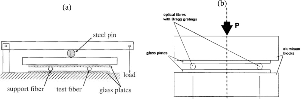 In the literature several designs for transverse strain calibrations are proposed, which can be subdivided into two main groups. The first group of authors uses a leverage arm and calibrated weights to load the fibre [30,43–46], the other group directly press the fibre with calibrated weights or with a test bench [32,42,47–50] (Figure 5). In the first group, Abe et al. [44] used two support fibres and one test fibre to quantify the effect of transverse loads on the Bragg spectrum. Two support fibres can, however, compromise the measurement, since, the load should be exactly on top of the test fibre and all fibres should have exactly the same diameter. Therefore, Wagreich et al. [43] used only one support fibre. Later, Lawrence et al. [30] and Bosia et al. [45] improved the test set-up by reducing the number of steel pins. The resulting test set-up is shown in Figure 5(a). In the second group, the differences amongst the different test set-ups are mainly related to the use of guiding pins of the load stamp [47,48] or not [32,49,50]. By removing the guiding pins, all friction is eliminated out of the system, however, when the load stamp moves during calibration, the orientation of the optical fibre (certainly for polarization maintaining fibres (PM-fibres)) becomes uncertain.