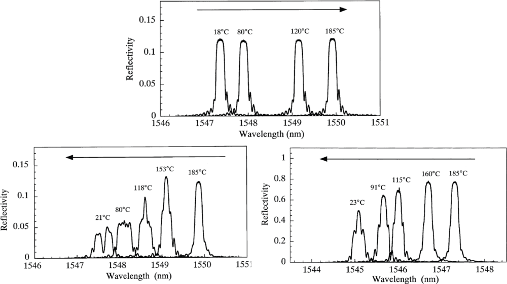 - Sugden, K.; Zhang, L.; Williams, J.A.R.; Fallon, R.W.; Everall, L.A.; Chisholm, K.E.; Bennion, I. Fabrication and characterization of bandpass filters based on concatenated chirped fiber gratings. J. Lightw. Tech 1997, 15, 1424–1432. [Google Scholar]