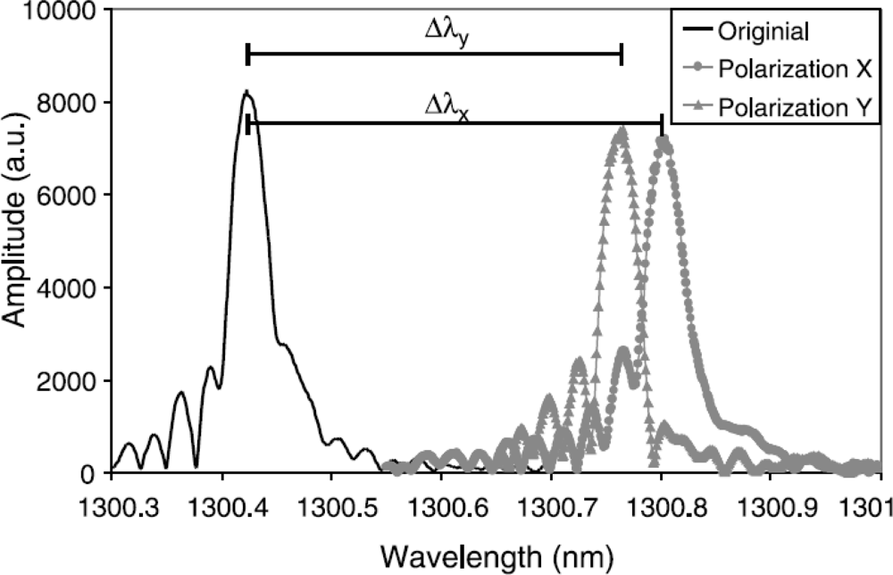 FBGs can be considered as a point sensor. However, local strain gradients (axial [63,64] as well as transversal strain [53,65–67]) can severely distort the Bragg spectrum. The difference between both is often difficult to make. A method to discriminate between both types can be found in the polarization control of the input light sent in the optical fibre [68,69] (Figure 8). Apart from this, the gradients can be related to the embedding process [70,71] of the FBG in the composite material or can originate from a specific loading case (e.g., bending [64,72]). For example Figure 7(c) represents the spectrum of an FBG embedded in a 5-harness satin weave thermoplastic composite. The axial strain profile of such a material has been numerically determined by Daggumati et al. [73]. The authors found that a clear strain gradient exist over the length of the grating and that matching axial strain results were found between the numerically determined profiles and measured profile. Kang et al. studied the response of a grating mounted on a beam which is clamped at one side and bended at the other [64]. In this way, a strain gradient is created over the length of the beam and the grating. One of the conclusions in this research is keeping the grating length as short as possible to minimize strain gradients over the grating. One should however remark that when embedded and measuring only the local strain over a short gauge distance inside a fibrous composite structure, this is not necessarily equal to the global strain of the structure [73–75].