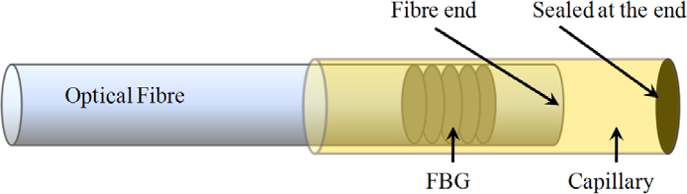 Although not necessary for temperature compensation, the use of an identical FBG makes compensation very easy by just subtracting the wavelength shift of the strain free sensor from the total wavelength shift of the strain sensor. For embedded strain sensors this method can be expanded by embedding an extra Bragg sensor in a strain free compensating plate which has an identical lay-up as the structure in which the strain sensor is embedded [98]. As such, one can focus only on strain fields caused by external loads. The reference FBG should be located in the same thermal environment as the strain sensor. If one only wants to compensate for the intrinsic temperature behaviour of the grating, one can think of encapsulating a reference grating and embed this in the material. This reference grating should be isolated from the existing strain field in the material by ending it strain–free inside the capillary (glass, fused silica or metal) (Figure 9) [60,99–102].