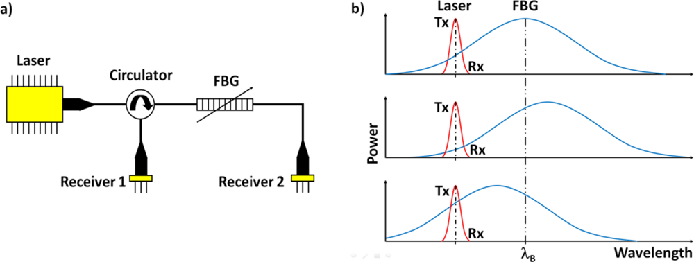 Typically, power detection is used to convert the shift in the Bragg wavelength to an intensity change [13]. Here, one side of the FBGs spectral reflectivity curve is used as a linear filter. A narrow band laser source, centered about the 3 dB point, is then intensity modulated as the applied signal shifts the filter response. The modulation that occurs to the reflected signal also occurs to the transmitted signal [14]. When the change in the reflected optical power is positive, the change in transmitted optical power is negative, and vice versa. Since one signal is positive, and the other is negative, the transmitted (Tx) and reflected (Rx) signals can be differentially amplified, giving increased signal strength. The configuration of the optical circuit for this Transmit Reflect Detection System (TRDS) is shown in Figure 1(a), with Figure 1(b) illustrating the principle of operation. The TRDS has previously been used for the detection of AU signals [15].
