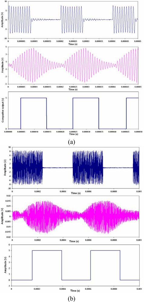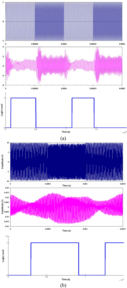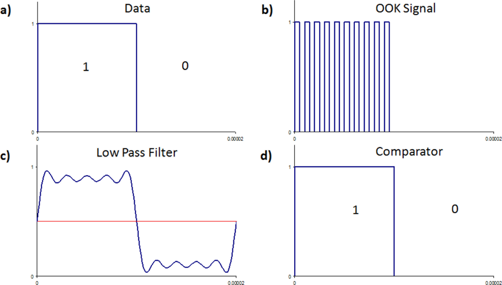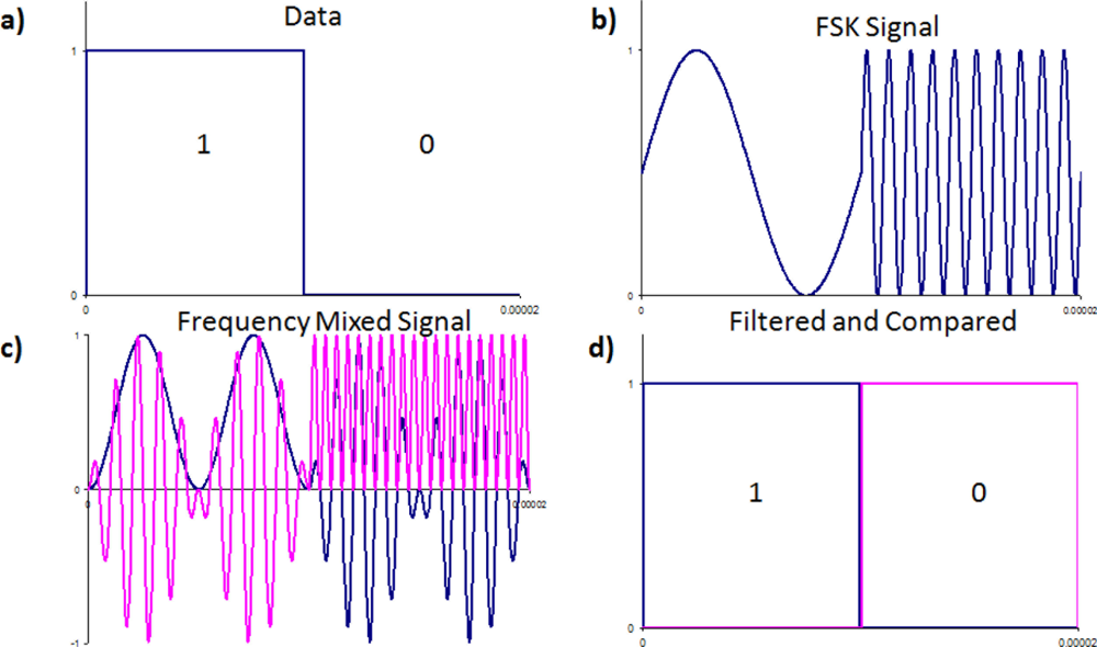 The two signals are each multiplying with a synchronous cosine, one with frequency f1, the other with frequency f2, shown in Figure 3(c). This shifts the signal to zero and 2fn, that is, one of the data bits has no DC offset, while the second bit has a DC offset. A low pass filter is used to remove the 2fn component from each signal. When filtered, the lack of an offset will result in a zero, while an offset will give a one. The two filtered signals are then compared to each other to recover the digital information. The recovered signal after the filter and comparator is shown in Figure 3(d).