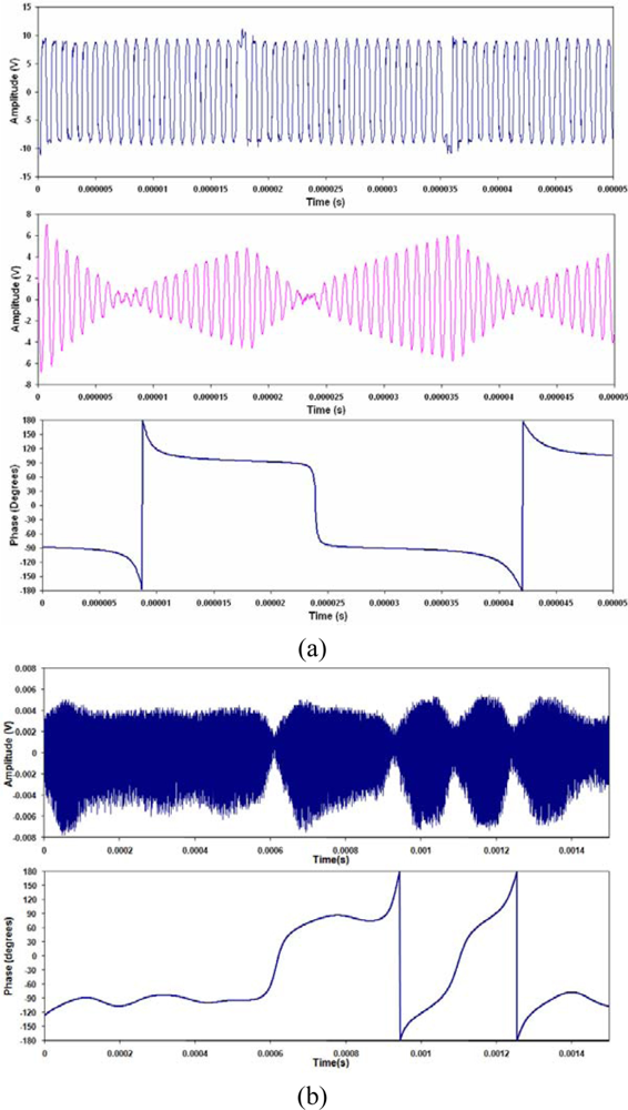 In general, all of the communications signal changes, i.e., switching the amplitude, frequency, or phase, have the same effect relative to the PZT transmitter. All three methods appear as one signal being switched off, and then a second signal being switched on, due to the resonant nature of the channel. The transient response is therefore the limiting factor for the data rate achievable.
