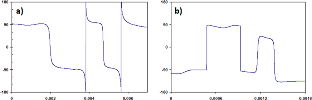 PSK represents the most effective and reliable method of transmitting data through any of the communications channels. Any variations that result in changes to the amplitude of the signal will in essence have little effect on the phase of the signal. PSK also represents the most likely method to be improved beyond the limit of the transient response. Higher data rates could be achieved if the direction of the phase changes could be chosen. That is, instead of the phase changing in a random direction, from −90° to 90° via 0° or 180° (as seen in the phase diagrams of Figure 11), the phase was forced to switch from −90° to 90° via 0° all the time (as seen in Figure 12(b)), the levels, −90° or 90° would no longer be needed. Smaller values could be used, e.g., −45° or 45°, which could effectively double the data rate with the same channel characteristics.