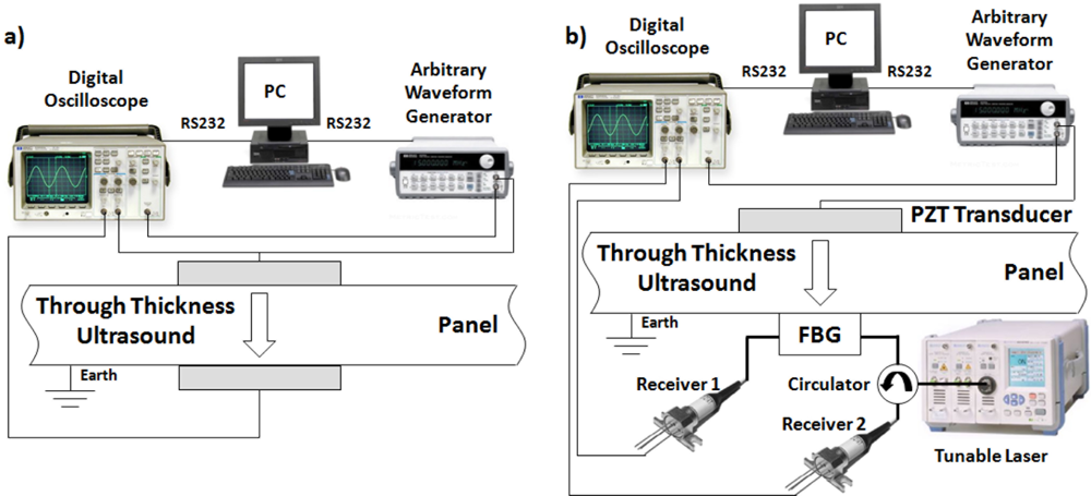 In total, five configurations were tested: PZT transmitter, Al medium, PZT receiver (Al-PZT); PZT transmitter, CFC medium, PZT receiver (CFC-PZT); PZT transmitter, Al medium, FBG receiver (Al-FBG); PZT transmitter, CFC medium, coupled FBG receiver (CFC-cFBG); and, PZT transmitter, CFC medium, embedded FBG receiver (CFC-eFBG).