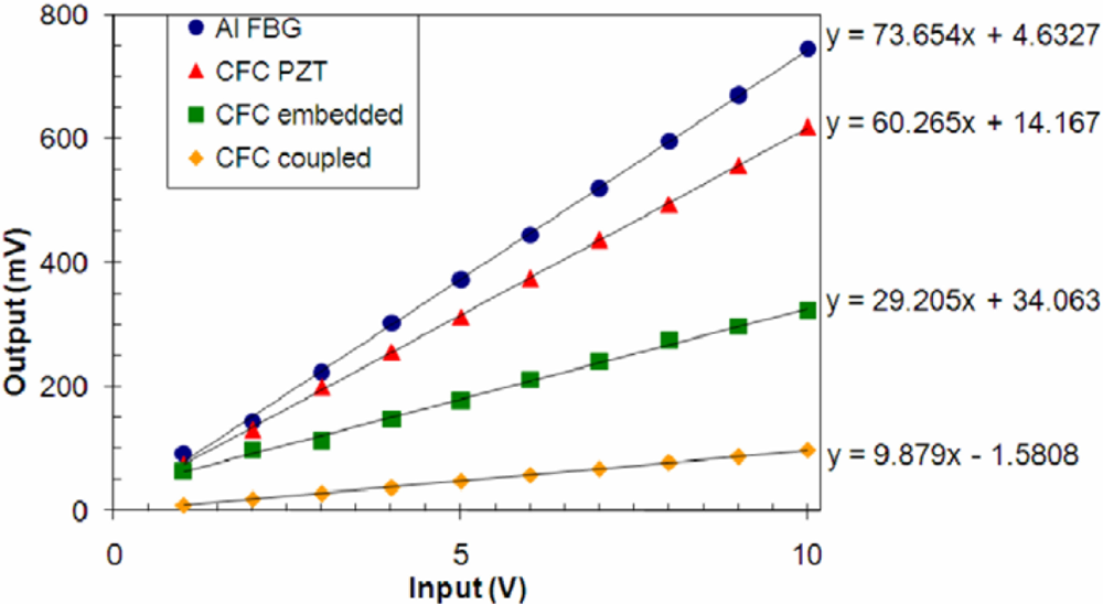 The transfer functions for four of the five configurations tested are shown in Figure 6. The Al-PZT configuration is not shown due to the significantly larger efficiency at the through thickness resonance, with a sensitivity of 882.8 mV/V. All transfer functions are linear, and show that significant signal strengths are achievable in all configurations, even with no amplification.