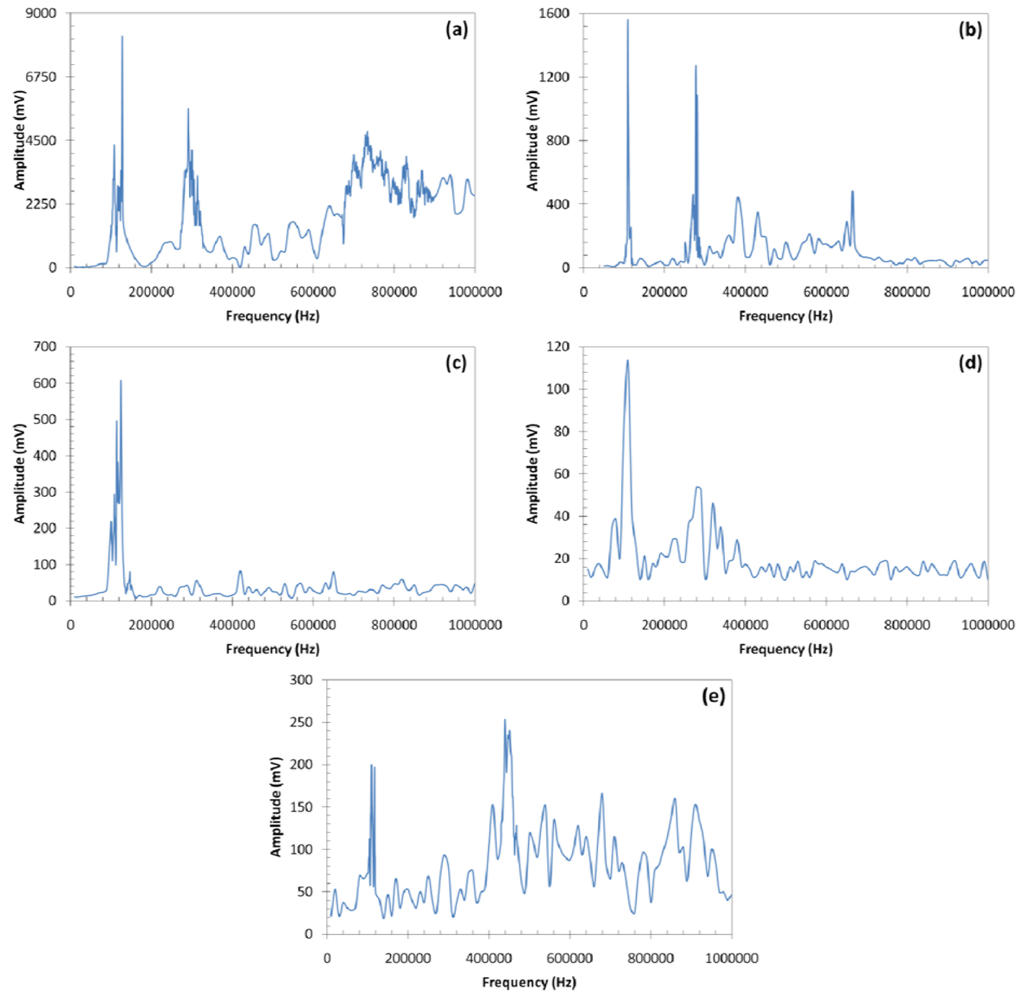 The frequency responses of all five configurations are shown in Figure 7. All curves show a low frequency resonance, about 100 kHz, which corresponds to the first radial mode of the PZT transducer, with a diameter of 20 mm. The most interesting feature of the frequency response curves is the primary peak at 440 kHz for the CFC-eFBG channel, which is not a significant feature in any other curve. This peak is broad which is good for communications purposes, since data rate is related to bandwidth.