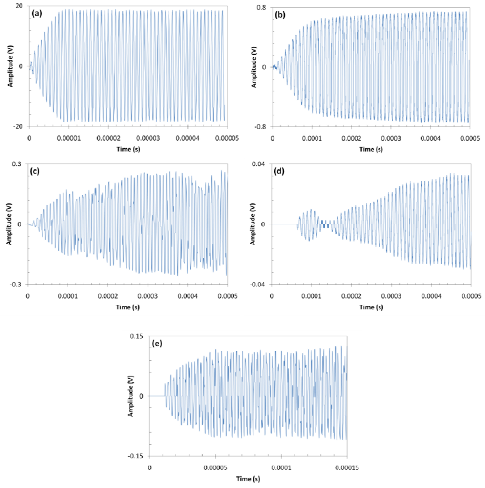 Finally, the transient response of the systems was investigated. A low rate sine wave burst at resonance was used, with 100 cycles. The trailing signal was also examined to determine if it would have any adverse effects on the performance of the communications channel.