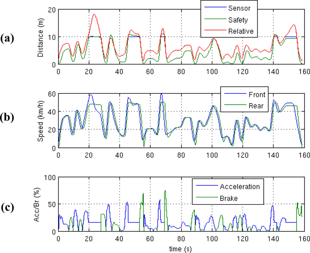 As shown in Figure 2(a), the distance between vehicles is always greater than the stopping distance, even though the second is not known by the control system, because it does not know the absolute speed. Figure 2(b) shows that the controlled vehicle never exceeds 50 km/h. even though the vehicle ahead does so. When the distance between vehicles exceeds 10 m, which is beyond the sensor range, the controlled vehicle stabilizes its speed at about 50 km/h. In Figure 2(c), the control actions on the accelerator and brake are shown. At the end of the simulation, it can be seen how the leading vehicle performs a sudden braking maneuver, and the controlled vehicle stops at a distance of slightly more than one metre from it without crashing, the brakes remaining at a value around 30% of their capacity.