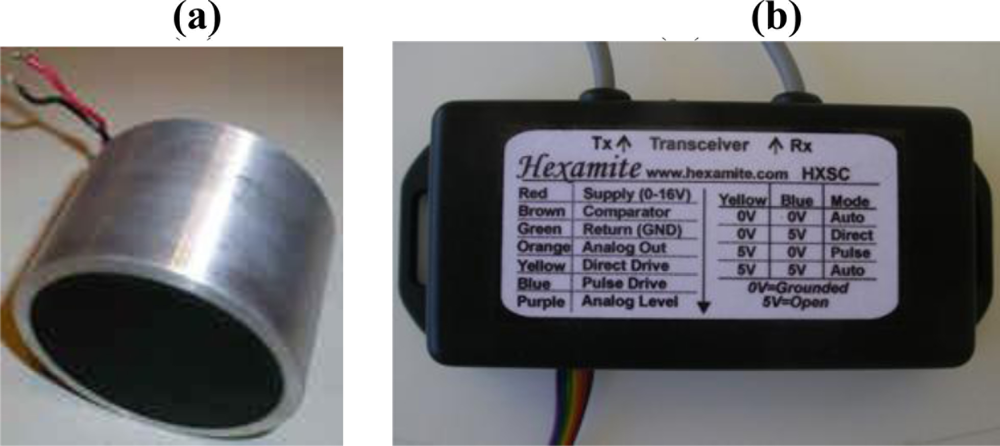 A prototype has been implemented using a Hexamite HXN43TR ultrasonic sensor acting as transmitter-receiver, shown in Figure 3 together with its signal conditioner. The most important characteristics of this sensor are its central frequency of 43.0 ± 5.0 kHz, its bandwidth of 4 kHz and its narrow beam pattern of 8.5° at −3 dB.