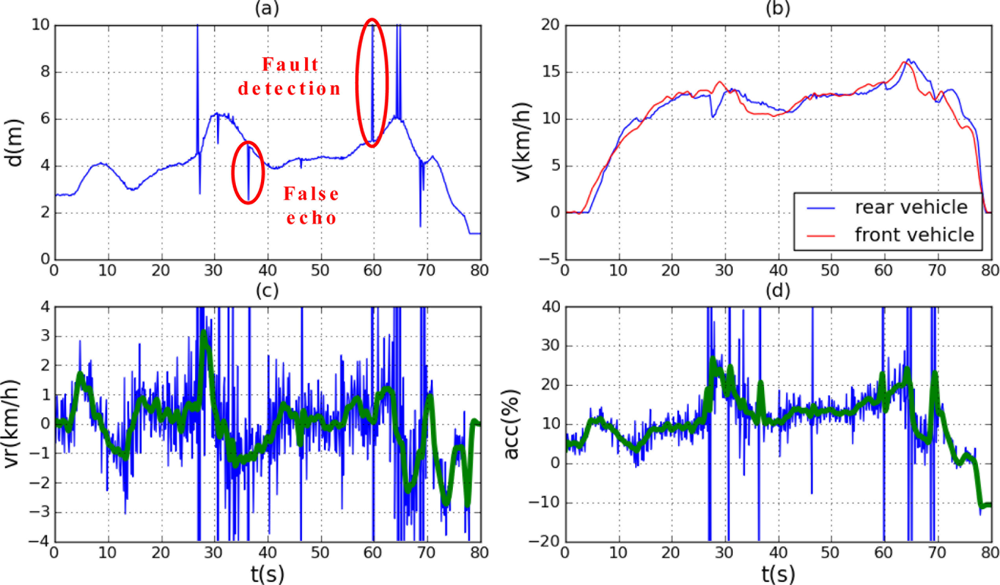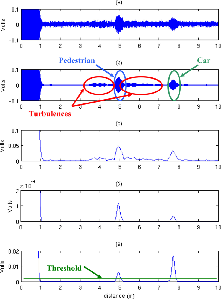 Finally, the distance between vehicles is obtained by comparing the resulting signal with a preset threshold level. The first time the signal exceeds this threshold is the well-known time of flight. The distance is calculated by multiplying the time of flight by the speed of sound in air, and halving to take into account that the ultrasonic pulse goes back and forth between the sensor and the vehicle ahead. Figure 4 shows a real ultrasonic signal acquired with the ultrasonic sensor described, together with the results of the processing steps. The capture time is equivalent to a maximum distance of 10 m. The emitted pulse is about 1 m long, during which it is not possible to receive any echo. For this reason the output of the mathematical model of the ultrasonic system was bounded between these two values. Echoes from a pedestrian located at 4.8 m from the sensor and a vehicle located at 7.5 m can be observed. The effects of turbulences can be seen in Figure 4(b,c), while in Figure 4(d,e) they are not visible.