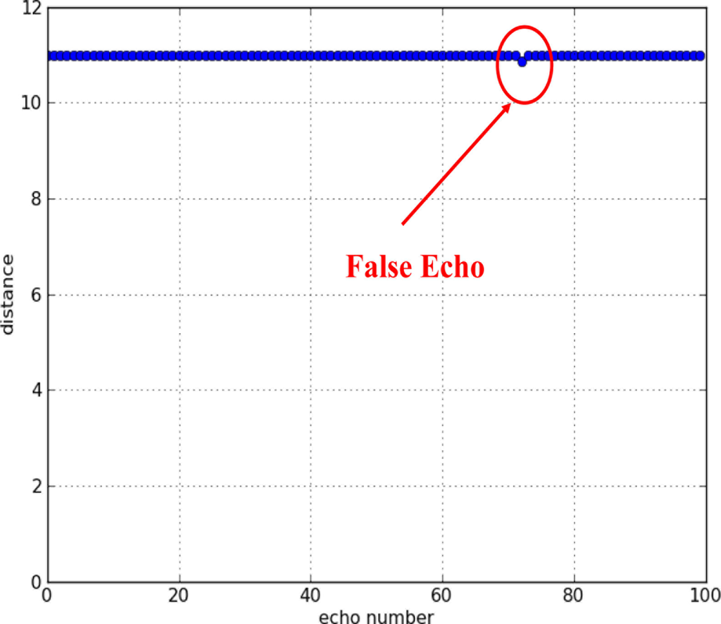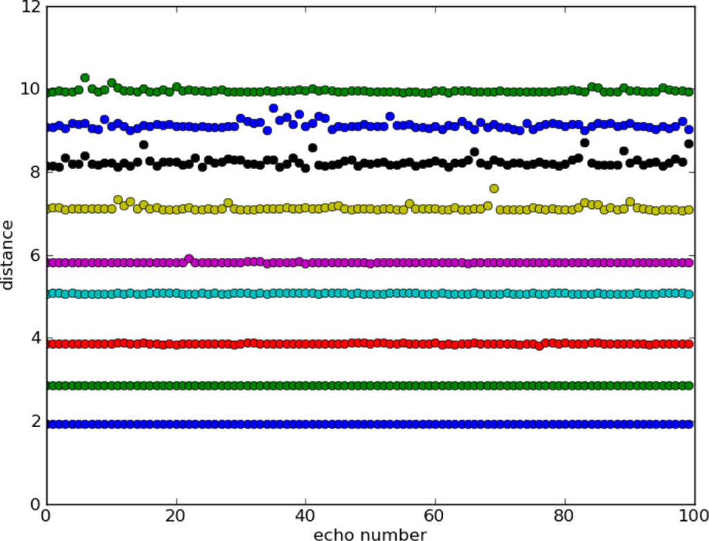 To adjust the threshold level, 100 echoes were recorded in a range of 11 m, with the sensor at rest and no obstacles in front. The threshold has been reduced slowly, until at a final value of 2 × 10−4 a false echo has been detected. Figure 5 shows the measurements resulting from this experiment.