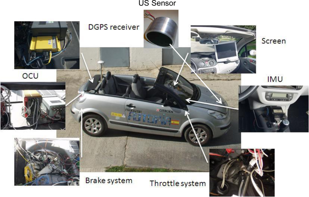The ultrasonic system described above was installed in a prototype vehicle, which is part of the AUTOPIA program autonomous vehicle fleet [8]. Specifically, a convertible Citroën C3 Pluriel has been used [9] for this application. The vehicle is a commercial car with the minimum modifications to manage the actuators autonomously. Figure 8 shows the vehicle and the different systems that have been installed during its automation process. Hereafter, vehicle modifications are described.