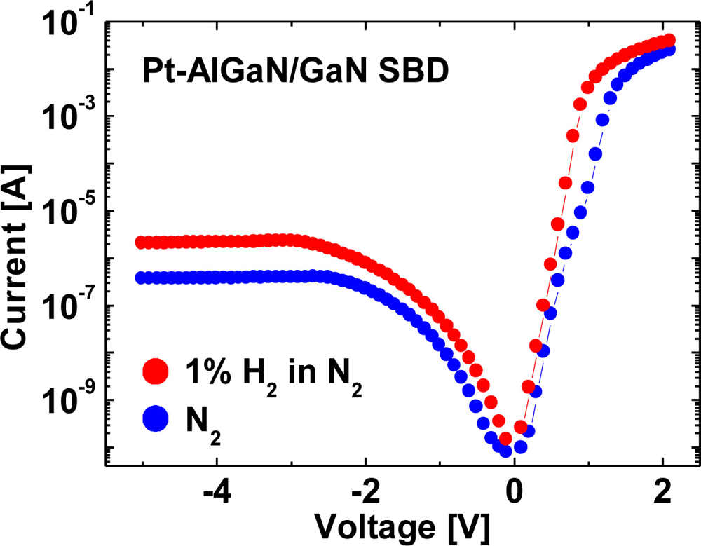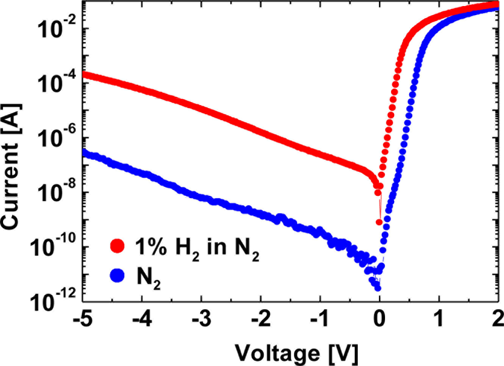For GaN Schottky diode-type hydrogen sensors, it was reported that an oxidic intermediate layer between the catalytic Schottky contact and the GaN surface is the origin of the hydrogen sensitivity of Pd–GaN Schottky diodes, implying that the metal /semiconductor interfacial modification would lead to significant change in the interaction of hydrogen with devices [15]. Several authors have reported the critical role of the dielectric layer between the Schottky metal and the GaN surface in hydrogen sensitivity of devices [16–22]. In this report, firstly, hydrogen sensing characteristics of Pt–GaN Schottky diodes fabricated on intentionally defect-introduced GaN surfaces are investigated. Secondly, influence of dielectric layers, including SiO2, SixNy and AlGaN layers, between the metal and semiconductor interface on hydrogen detection was studied. Figure 1 shows the I–V characteristics for a Pt–(Si-doped) GaN Schottky diode in a N2 ambient and the response to the exposure to 1% H2 in N2 at room temperature.