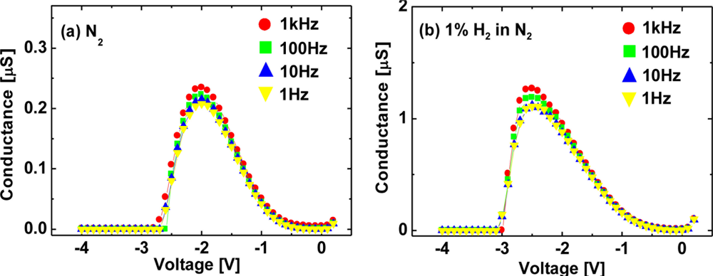 The G–V curves in Figure 11 suggest the following three issues: First, the conductance goes through a peak and approaches zero on either side. Second, the maximum values of the conductance in H2 is much higher than those in N2, which is probably related to the enhanced current under a given bias in I–V characteristics upon the introduction of hydrogen, as shown in Figure 10. Third, the G–V curves show frequency dependence. The peak magnitude of the conductance increases with increasing frequency in both ambients.