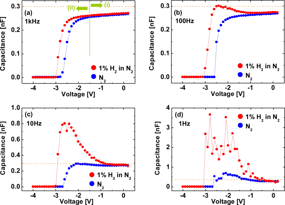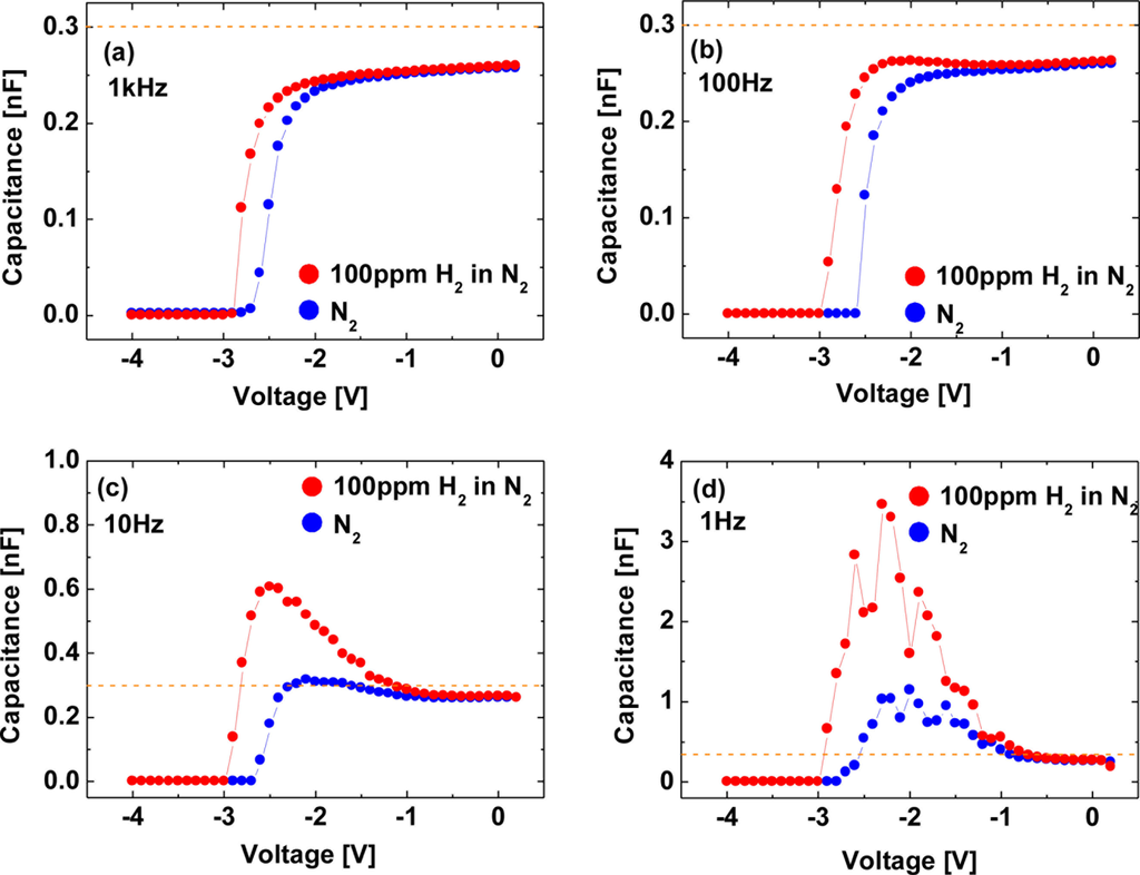 Hydrogen interaction with the devices was investigated using a stainless-steel reaction chamber with tungsten probes under a flowing ambient (100 mL/min) of either N2 or H2 in N2 at a total pressure of 10.0 kPa at room temperature. Here, either 1% or 100 ppm H2 in N2 gas was employed. The C–V and conductance-voltage (G–V) characteristics were acquired using parallel circuit mode.