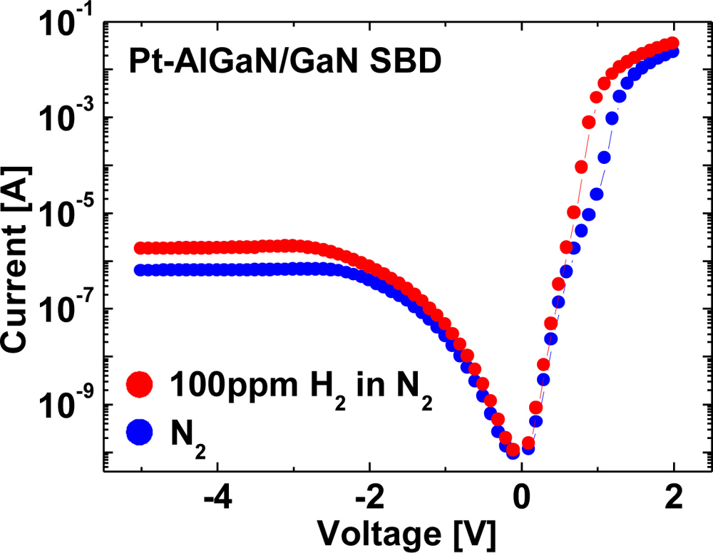 In the previous studies, high-frequency C–V characterization was typically employed in order to elucidate the reaction mechanism. As a result, a shift of the C–V curves toward negative bias values upon hydrogen exposure was observed, concluding that the formation of a dipole layer reduces the effective Schottky barrier height. The formation of the dipole layer should increase the capacitance; however, no increase of the capacitance has been reported yet. We presumed that very low frequencies are required in order to observe the proposed dipole layer and to investigate the reaction mechanism. Here, we demonstrate a clear change in the C–V characteristics of Pt–AlGaN/GaN SBDs exposed to hydrogen using a low frequency [37]. Typical I–V characteristics of the Pt–AlGaN/GaN SBD in N2 and response to exposure to 1% H2 in N2 at room temperature are shown in Figure 10.