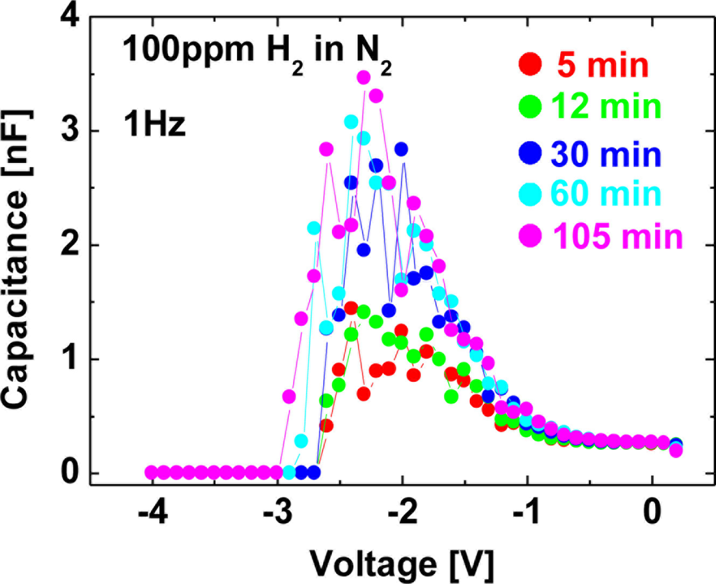 By sharp contrast, at 1% H2, capacitances saturate instantaneously. In low H2 concentrations like 100 ppm, it takes more than 60 min to saturate the C–V characteristics (and also I–V characteristics), as shown in Figure 15, suggesting that hydrogen-induced dipole formation needs longer time in lower concentration of a hydrogen ambient. But, using low-frequency C–V characterization leads to clear detection of 100 ppm hydrogen even at room temperature where it is hard to detect hydrogen by using conventional I–V characterization, suggesting that low-frequency C–V method would be effective in detecting very low concentration of hydrogen.