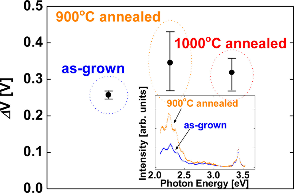 Here, the sensitivity is defined as a shift of voltage upon exposure to 1% H2 in N2 at a current of 0.1 nA. The error bars represent the range of the measured values. Although the devices fabricated on annealed surfaces displayed a slightly increased sensitivity, taking the error bars of the sensitivity into consideration, significant differences of the sensitivity among the devices are not observed, once again. On the other hand, the inset of Figure 3 shows the room temperature photoluminescence spectra of as-grown and 900 °C annealed GaN surfaces. The spectra have near-bandedge emission around 3.4 eV. The broad deep level emission around 2.2 eV is modulated by the Fabry-Perot interference fringes. As shown in the inset of Figure 3, 900 °C annealed GaN sample shows stronger deep level emission around 2.2 eV than as-grown sample does. This deep level emission is generally attributed to point defects and antisites, suggesting that high temperature annealing created these defects in the sample surface [25]. Though the PL spectra reveal the clear difference of the surface defects between as-grown and annealed surfaces as shown in the inset of Figure 3, the devices fabricated on annealed surfaces show the similar in hydrogen detection sensitivity to those on as-grown surfaces as shown in Figures 2 and 3. These results suggest that the surface defects of GaN do not play a critical role in hydrogen sensing characteristics of Pt–GaN Schottky diodes.