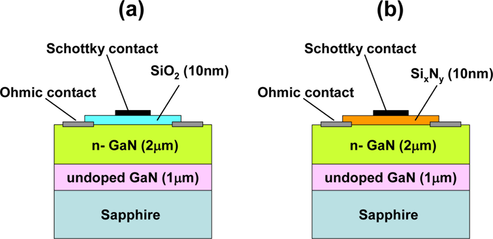 In order to investigate the influence of dielectric layers, including SiO2, SixNy and AlGaN layers, between the metal and semiconductor interface, on hydrogen detection sensitivity, hydrogen response of Pt–GaN diodes with dielectric layers was studied. Figure 4 shows the schematic cross sections of the MIS Pt–GaN diodes with both 10 nm SiO2 and 10 nm SixNy dielectrics, respectively.