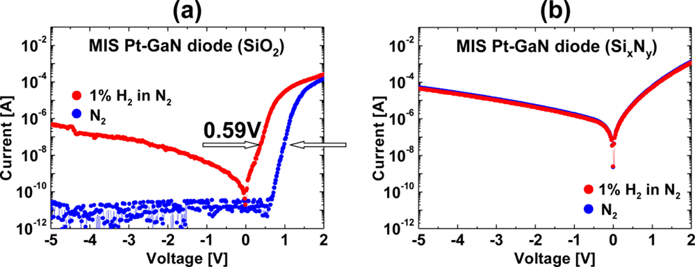 In the previous section, I compared the hydrogen response of MIS Pt–GaN diodes with both 10 nm SiO2 and 10 nm SixNy dielectrics. As a result, MIS Pt–GaN diodes with a SiO2 dielectric showed a marked improvement in hydrogen detection sensitivity. In sharp contrast, MIS Pt–GaN diodes with a SixNy dielectric did not show any hydrogen response. Since the changes in the I–V characteristics of devices are totally different for the two dielectric layers, detailed investigation for these phenomena would lead to the elucidation of the interaction mechanism of hydrogen with semiconductor devices. Here, I–V and C–V characteristics are performed for MIS Pt–GaN diodes with both SiO2 and SixNy dielectrics, and the changes in the electrical properties are discussed.