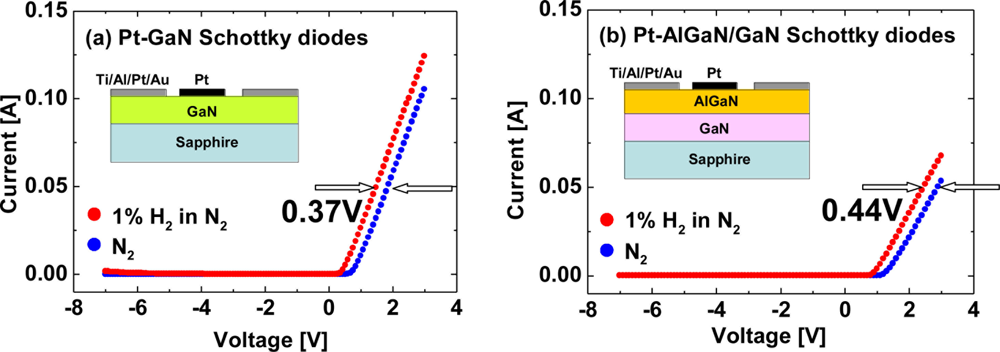 As shown in Figure 6, the sensitivities of the Pt–GaN and Pt–AlGaN/GaN diodes are 0.37 V and 0.44 V, respectively. Here, the sensitivities are defined as shifts in voltage upon exposure to 1% H2 in N2 at a current of 0.05 A. The Pt–AlGaN/GaN diode shows slightly higher sensitivity as compared with that of the Pt–GaN device, consistent with the previous report [26]. Note that the Pt–GaN diode show relatively higher leakage current in H2 ambient, as shown in Figure 6(a). In sharp contrast, Pt–AlGaN/GaN diode shows no leakage current in both ambients. Therefore, Pt–AlGaN/GaN devices would be suitable for application to highly-sensitive hydrogen sensors operated at high temperature. The detailed hydrogen sensing mechanism of Pt–AlGaN diodes are discussed in Section 3.3.