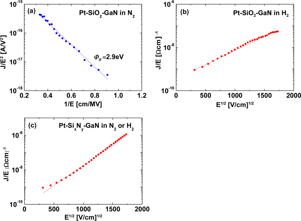 The conduction mechanism for MIS Pt–GaN diodes with both SiO2 and SixNy dielectrics is investigated as follows. In the oxide field range of 0.3–0.9 MV/cm, for MIS Pt–GaN diodes with a SiO2 dielectric, the measured I–V data in a N2 ambient were fitted using the Fowler–Nordheim (FN) tunneling model, as shown in Figure 7(a).