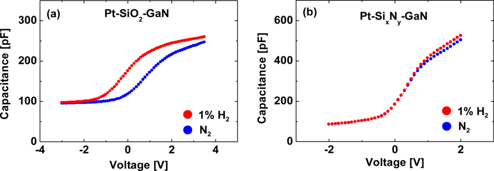 Figures 8(a,b) show room-temperature C–V characteristics at 10 kHz of the MIS Pt–GaN diodes with both SiO2 and SixNy dielectrics in a N2 ambient and the response to the exposure to 1% H2 in N2, respectively. Bias voltage was swept from accumulation to depletion.