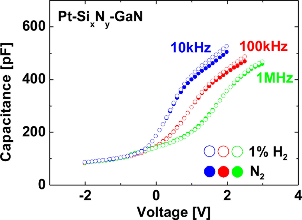 Figure 9 shows room-temperature C–V characteristics of the MIS Pt–GaN diodes with a SixNy dielectric at measurement frequencies of 10 kHz, 100 kHz and 1 MHz in a N2 ambient and the response to the exposure to 1% H2 in N2.