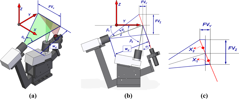 The field of view of the camera in Y and Z direction [shown in Figure 1(b)] can be calculated as the sum of X1 and X2 components in Y and Z axis [Figure 1(c)]. X1 and X2 can also be related with the geometrical parameters of the LTS as shown in Equations (2) and (3):
