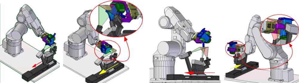 A test with different α values has been performed. In this test is shown that high α values result in laser reflections in the wall of the hole and this effect generates localization inaccuracy (Figure 3). α = 20° is defined to avoid laser reflections and β = α is assigned for minimize the field of view in Y and Z.