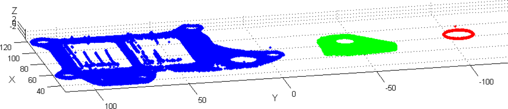 Similar results are obtained for the fixation bracket. The coordinates of the reconstructed points of each element expressed in the global frame of the part are graphed in Figure 17.