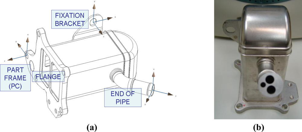 Since the master piece is measured with a CMM, the transformation matrix between each element and the global frame of the part is known, PCMN. As it appears in Figure 12(b), a circular gauge with three holes is inserted in the pipe of the master piece to materialize a measurable local frame. LTSM0,PC is calculated from the scanned cloud points, as LTSM0,pc in (16) and LTSMi,PC can be calculated (20):