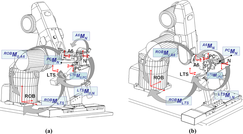 In (16) LTSM0,pc is calculated from the scanned cloud points but the other matrices are unknown. It is possible to write the same links for the measurement of another element with the robot in position i (17), Figure 13(b):