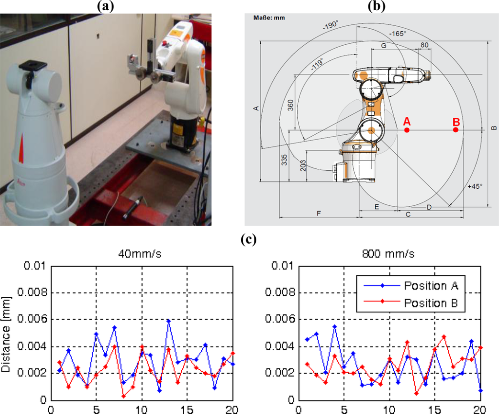 A repeatability test [34] has been performed at different speeds to reach points A and B shown in Figure 14. The distance between A and B was 300 mm and 20 iterations where made positioning the robot at each point. A laser tracker was used to measure the reached positions. For the speed tested the positioning repeatability results remain under 6 μm. Trials were carried out with the tracker retroreflector in the center and the periphery of the support of the robot, giving repeatability of the order of the previous ones and therefore lower orientation errors.