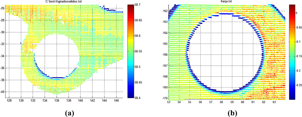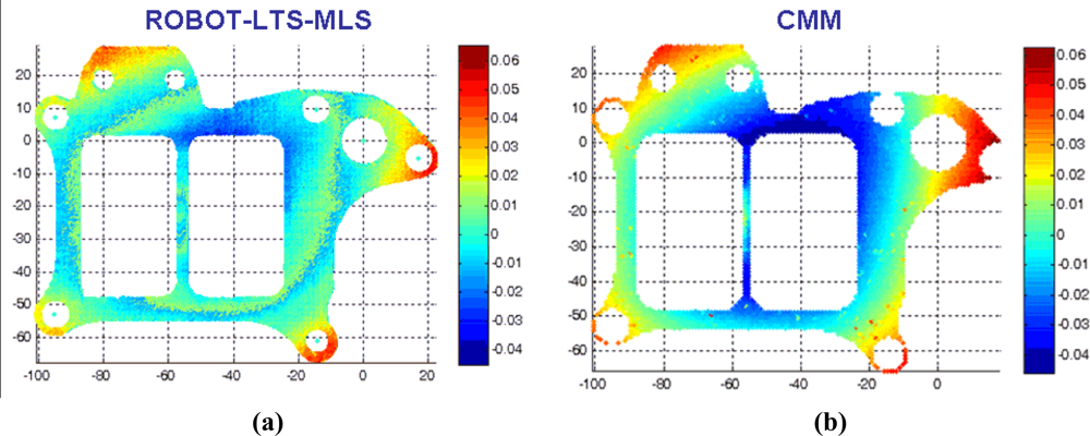 Once the iterations have been carried out, and after analyzing the measurement images and the digitalized points, the flatness results shown in Figure 16 are obtained for the flange. As mentioned above, the distance from the theoretical plane of each point on the flange is represented by a color scale. This distance is calculated using the Robot-MLS-LTS integrated system, and next it can be appreciated the distance between each point and the plane as measured using a CMM and the same color scale.