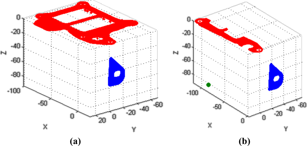 The transformation matrix between the n-th element and the frame of the part could be written as (16) using the transformation matrix that links the frames in Figure 13(a), where the system is scanning the global frame of the part (robot position 0):