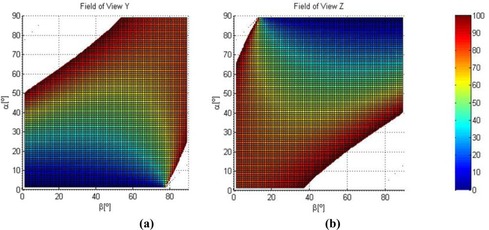 The influence of α (angle between laser and the vertical) and β (angle between camera and the horizontal) in the field of view in Y and Z direction is analysed, once the working distance, wd, is fixed from the initial specifications of the field of view in X direction and the lens characteristics (θh), Figure 2.