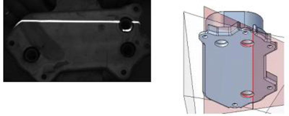 Once calibration of the LTS has been performed with the captured images of the LTS-gauge, the points in the laser line are known in the global frame of the LTS and the part surfaces can be scanned (Figure 9) using a robot to positioning each surface in the field of view of the LTS (Figure 10). This section shows a method for measuring the different surfaces of the part and establishes the position of each element in the frame of the part avoiding using robot data.