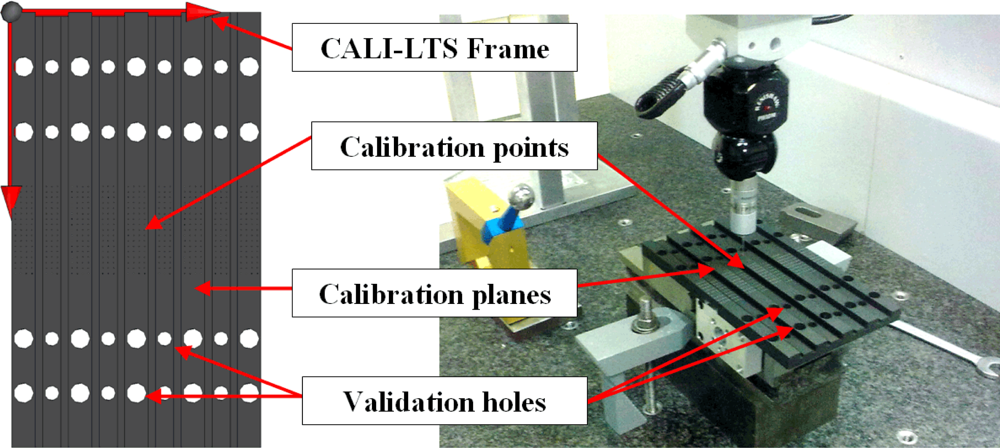 The gauge materializes well known nominal coordinates points distributed on different planes for the LTS calibration (Figure 5). The edge of each flat surface allows the characterization of direction of the MLS in the frame of the LTS. The frame of the LTS is defined by the calibration points of the gauge and it is equal to the frame of the gauge in the calibration position (CALI-LTS). The calibration target object allows the system validation by measuring the machined holes on its surface.